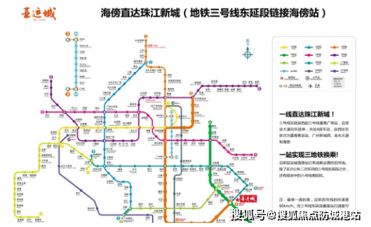 地铁配套方面,项目周边规划3/4/8号线三地铁交汇,形成便捷的地铁出行网络,彻底解决通勤难题。其中4号线已开通,距离项目最近的是海傍站,步行可达,6站直达琶洲,7站可到天河,满足日常通勤需求;3号线东延段海傍站已正式开通,始发站直达珠江新城,4站可达番禺广场TOD,5站抵达南村万博CBD,执掌番禺2大商务区,速达天河、荔湾等核心CBD,上班通勤高效便捷[1]。