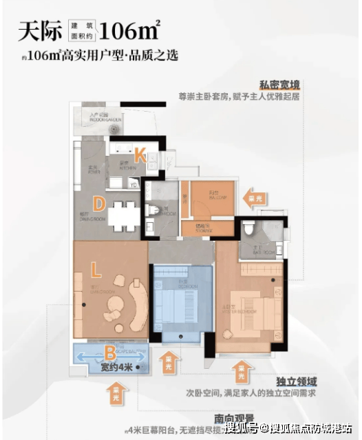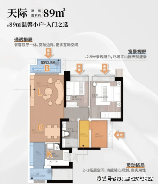 目前,项目在售主力组团为天际组团,总层高39层,交楼时间为2025年11月份,该组团推出约89-106-129㎡学铁商全能小户,六边形臻品上新,每一个户型都具备核心优势,全方位满足业主的居住需求[1]。其中,89㎡户型为刚需首选,三房设计,户型紧凑,南北通透,采光通风俱佳,客厅连接阳台,视野开阔,卧室布局合理,动静分离,既能满足三口之家的居住需求,又能控制购房成本,搭配限时98折优惠,刚需上车无压力。