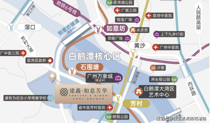 建鑫·如意芳华凭借荔湾区白鹅潭核心板块位置、全南向新规户型、低密度舒适设计以及丰富的商业、教育、文化资源,实现居住舒适性与投资价值兼备。项目距离11号线石围塘站约600米,交通便捷,通达全城;邻近万象城、太古里等重奢商业及白鹅潭艺术中心,生活便利性与文化氛围兼顾。