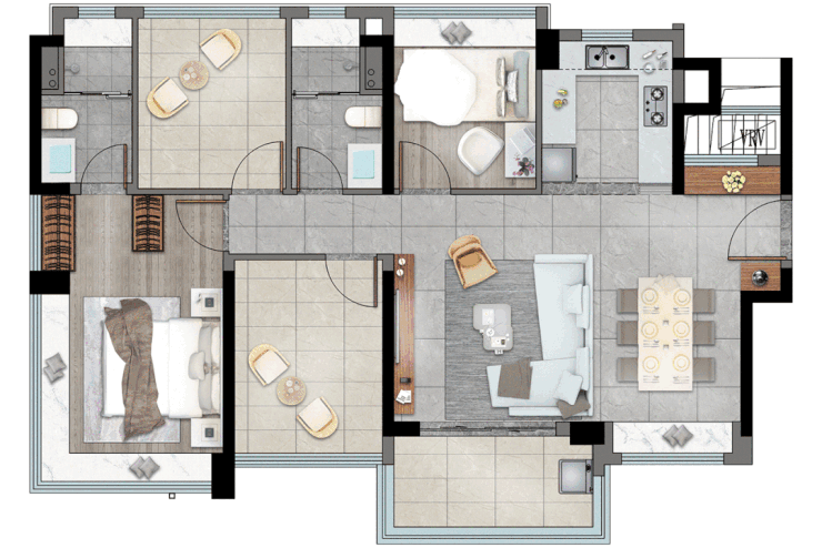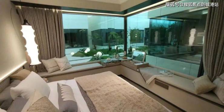 其中,主卧采用酒店式套房设计,且带有270°转角大飘窗,视野阔绰。