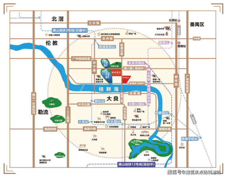 美的桂畔君兰交通通达性出众,坐拥地铁加高速双重枢纽体系。项目距佛山地铁三号线顺德人民医院站与新松站直线距离约两公里,可接驳广州七号线实现九站直达广州南站。未来还将接入佛山地铁十一号线与十三号线,覆盖广佛主轴区域,轨道网络畅达核心城区。