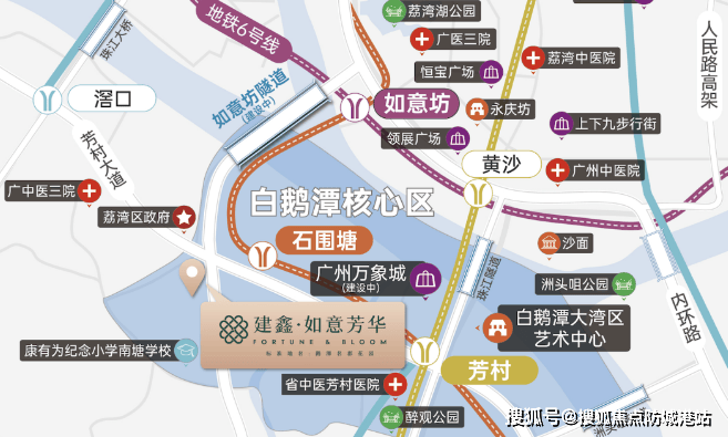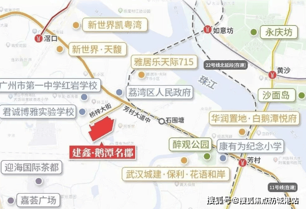 【建鑫·如意芳华】坐落于荔湾区白鹅潭板块,临近荔湾区政府和芳村大道中,地理位置优越。距离地铁11号线石围塘站仅约600米,步行即可到达。此外,通过芳村大道自驾出行也十分便捷,可以快速抵达白鹅潭万象城、聚龙湾太古里等新兴地标。