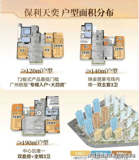 保利天奕首推综合素质最佳的 02 地块(近教育用地、城市界面好),户型设计颠覆传统改善盘逻辑:120㎡四房做到 270° 主卧飘窗 + 南北双阳台 + 8㎡入户前厅,LDKG 一体化打造 55㎡家庭超聚厅,部分非承重墙可改造,客厅面宽可拓展至 8 米;140㎡四房为双主套设计,南向采光面近 16 米(媲美汇悦台 236㎡户型),超 56㎡LDKG 巨幕厅 + 单边位三面采光,主套面积超 25㎡含步入式衣帽间;190㎡四房则有 3.3 米层高、超 18 米南向采光、9.1 米跑道式景观阳台,85㎡LDKB 一体化空间搭配 “温室平衡三管制” 全效中央空调,细节上全屋零涂料处理(木饰面 / 墙布 + 皮质硬包)、双层夹胶中空 low-E 玻璃隔音,兼顾健康与静谧。