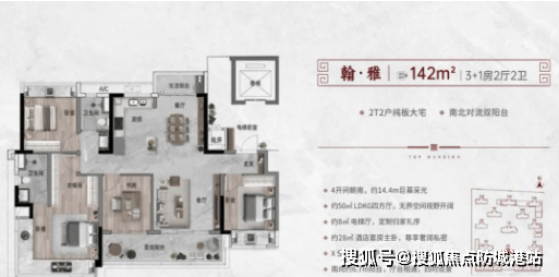 【翰·雅】:约142平方米,3+1房2厅2卫,南北对流双阳台,4开间朝南,约14.4米全面屏采光,约28平方米酒店套房主卧。