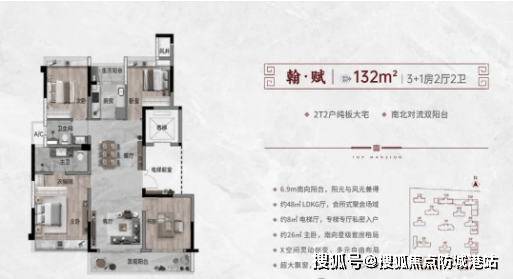 【翰·赋】:约132平方米,3+1房2厅2卫,南北对流双阳台,南面约6.9米全屏观景阳台。