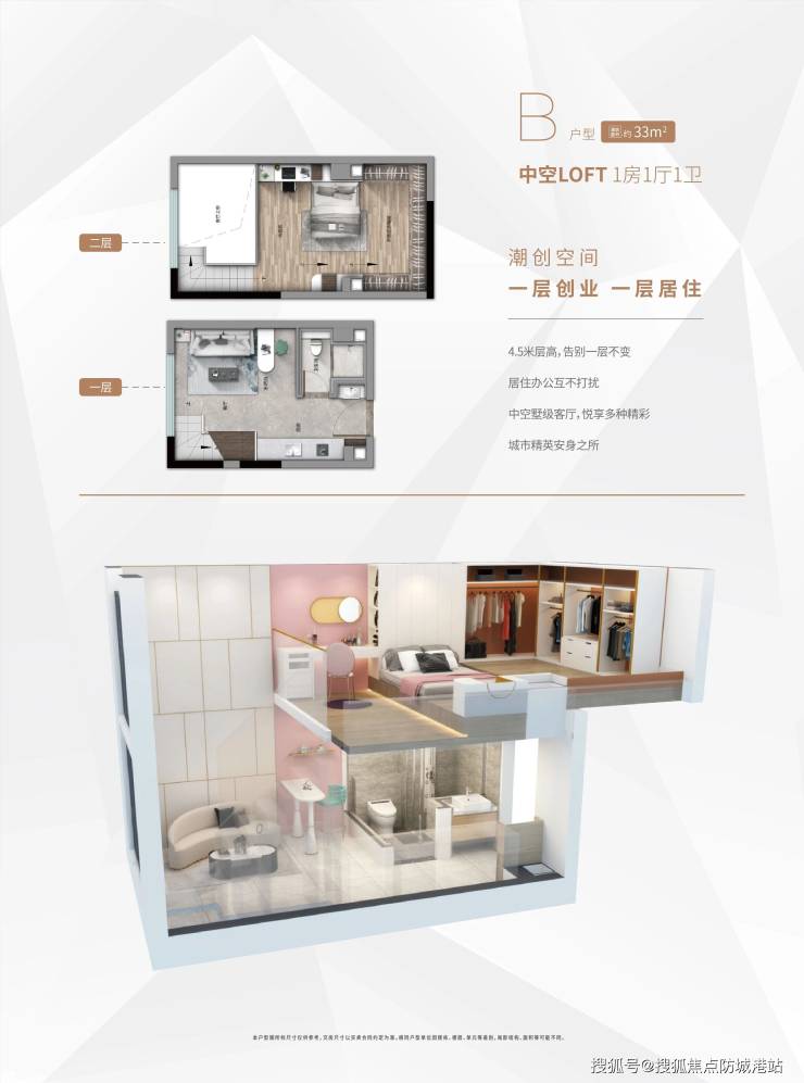 B户型建筑面积约33㎡,LOFT一房一厅设计,4.5米层高,可实现一层办公、一层居住,适合创业人士或年轻白领。对于刚创业的年轻人来说,不用额外租办公室,在家就能办公,节省租金成本;对于年轻白领来说,下班回家后,楼上休息,楼下休闲,空间灵活,而且总价门槛低,是扎根主城的绝佳选择。