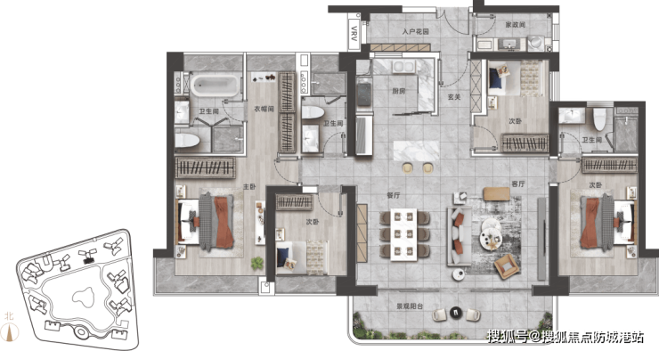 195平方米四房两厅三卫户型更是奢华至极。大面积入户花园,兼具储物与休闲等功能;瞰景边厅正南向四开间,约18.5米采光揽景面,其中观景阳台面宽7.7米;双主套房设计,均为270°超大飘窗;约50平方米的LDK客餐厨,格局灵动,满足多元代际需求。这种大尺度、大面宽的设计,让室内空间充满了通透感和流动感,真正实现了“推窗即海,出门即园”的生活愿景。
