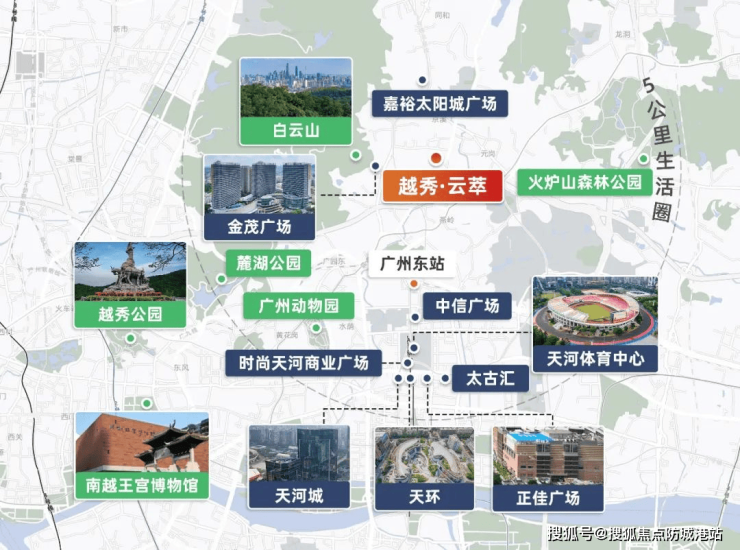 【越秀·云萃】周围生活配套设施完善,信达金茂广场距此仅1.3公里,而5公里范围内更是涵盖了体育中心、天河城、正佳广场等多个顶级商圈,满足居民日常生活和娱乐需求。
