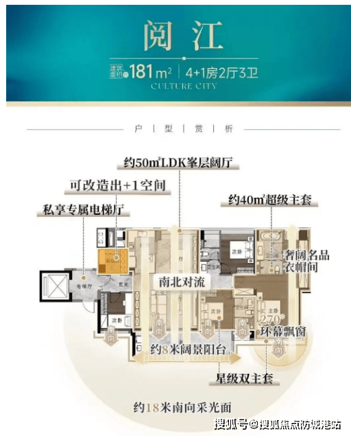 4. 建面约181㎡四房两厅三卫:该户型为终极改善大平层,堪称改善范本,整体格局恢弘,南北对流,拥有约18米南向IMAX湖景风光,全屋通透,穿堂风自由畅通。南向全景阳台面积近16㎡,拥有约8米的巨幕观景面,可打造品茗区、休闲区,晚饭过后,一家人可迎着湖风泡茶闲聊,享受惬意时光;除专属独立电梯厅外,室内还打造有约4㎡的入户鞋帽间,形成“内外双玄关”的设计,提升私密性与收纳空间;主卧套间奢华大气,配备超大独立卫生间、步入式衣帽间与全景飘窗,居住体验堪比星级酒店;三个次卧尺度充足,其中两个为套间设计,可满足长辈与孩子的居住需求,还有一个次卧可打造为书房、健身房或私人影院,满足高阶改善家庭的多元需求。