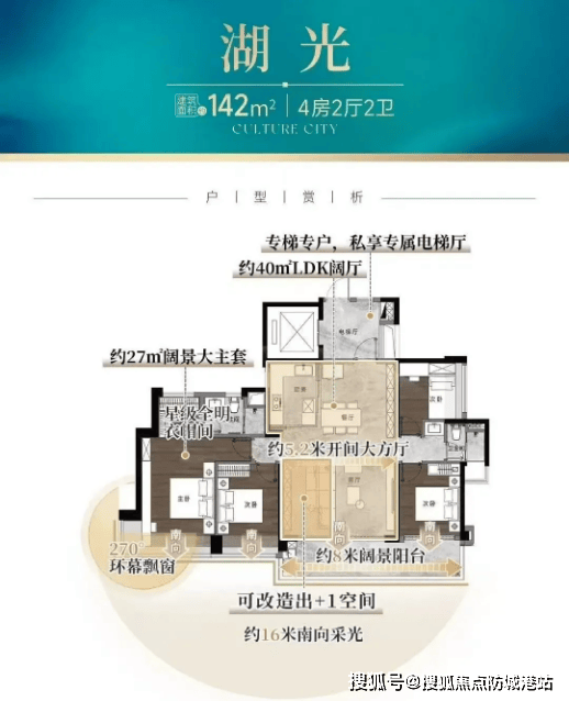 3. 建面约143㎡四房两厅三卫:该户型定位高端改善,格局方正,南北通透,拥有约16米南向采光面,站在约8米全景阳台,约1.2万㎡湖景扑面而来,高层还能望江,景观视野极佳。LDK一体化设计,客厅与餐厅空间开阔,搭配独立厨房,实用性与舒适度兼具;主卧套间设计,配备超大独立卫生间、步入式衣帽间与全景飘窗,私密性与尊崇感拉满;配备两个次卧套间,可作为长辈房与儿童房,兼顾隐私与便捷,其余一个次卧可打造为书房或休闲室,适配五口之家或有圈层社交需求的家庭。
