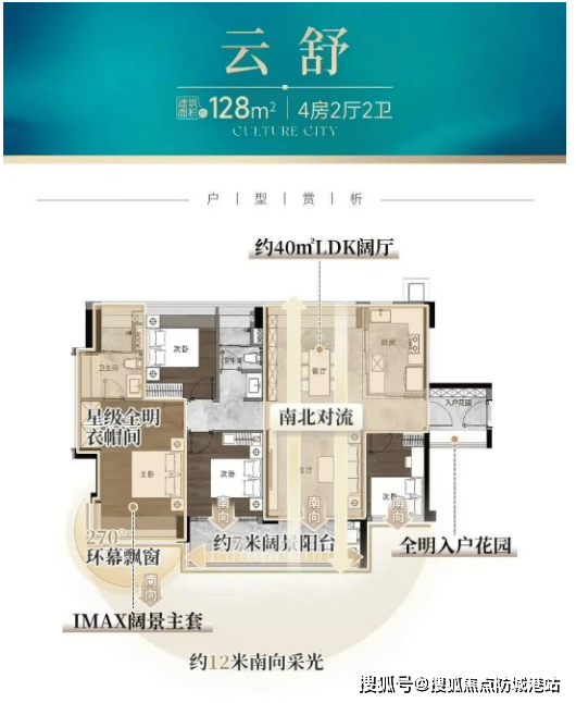2. 建面约128㎡四房两厅两卫:该户型定位中端改善,整体格局大气,南北对流,拥有约16米南向采光面,采光充足,穿堂风自由畅通。最大亮点是拥有一个约40㎡LDK阔厅,碾压市场同面积产品,客厅空间宽敞,可满足家庭聚会、会客等多元需求;阳台与客厅相连,视野开阔,可瞰社区湖景与园林景观;主卧采用套间设计,配备独立卫生间、衣帽间与飘窗,居住舒适度高;次卧尺度充足,其中两个次卧可放下1.8米大床,搭配衣柜与书桌,满足长辈与孩子的居住需求,适合四口之家居住。