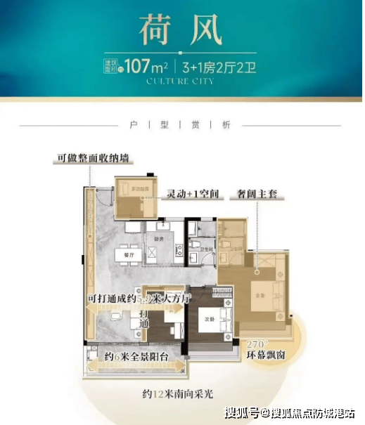 1. 建面约107㎡四房两厅两卫:该户型为刚需改善首选,整体格局方正,南北通透,拥有12米南向采光面,采光与通风效果极佳。采用通透LDK一体化设计,客厅、餐厅、厨房相连,空间视野开阔,方便家人互动交流;约6米奢阔阳台,连接客厅与次卧,既能满足日常晾晒需求,又能作为休闲观景区域,俯瞰社区园林美景;带有独立入户花园,既能起到缓冲作用,又能作为玄关收纳,提升户型实用性;四个卧室分布合理,主卧配备独立卫生间与衣帽间,私密性强,其余三个次卧尺度适中,可根据需求打造为儿童房、长辈房或书房,适配三口之家居住。