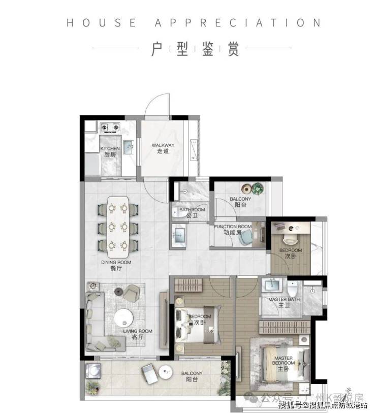 户型布局:采用3+1房2厅2卫布局,双阳台对流设计,多段式LDKG超长通厅,客厅、餐厅、厨房、阳台相连,形成通透的公共区域,通风效果极佳,空间感十足;卧室分布在通厅两侧,形成私密的休息区域,互不干扰,保证了休息区的私密性与安静度。厨房采用U字型布局,操作空间充足,储物能力强,方便日常烹饪;主卫为独立套房设计,配备270°转角飘窗、独立淋浴间、浴缸、洗手台,私密性强、舒适度高;次卫采用干湿分离设计,方便客人与孩子使用,实用性强。