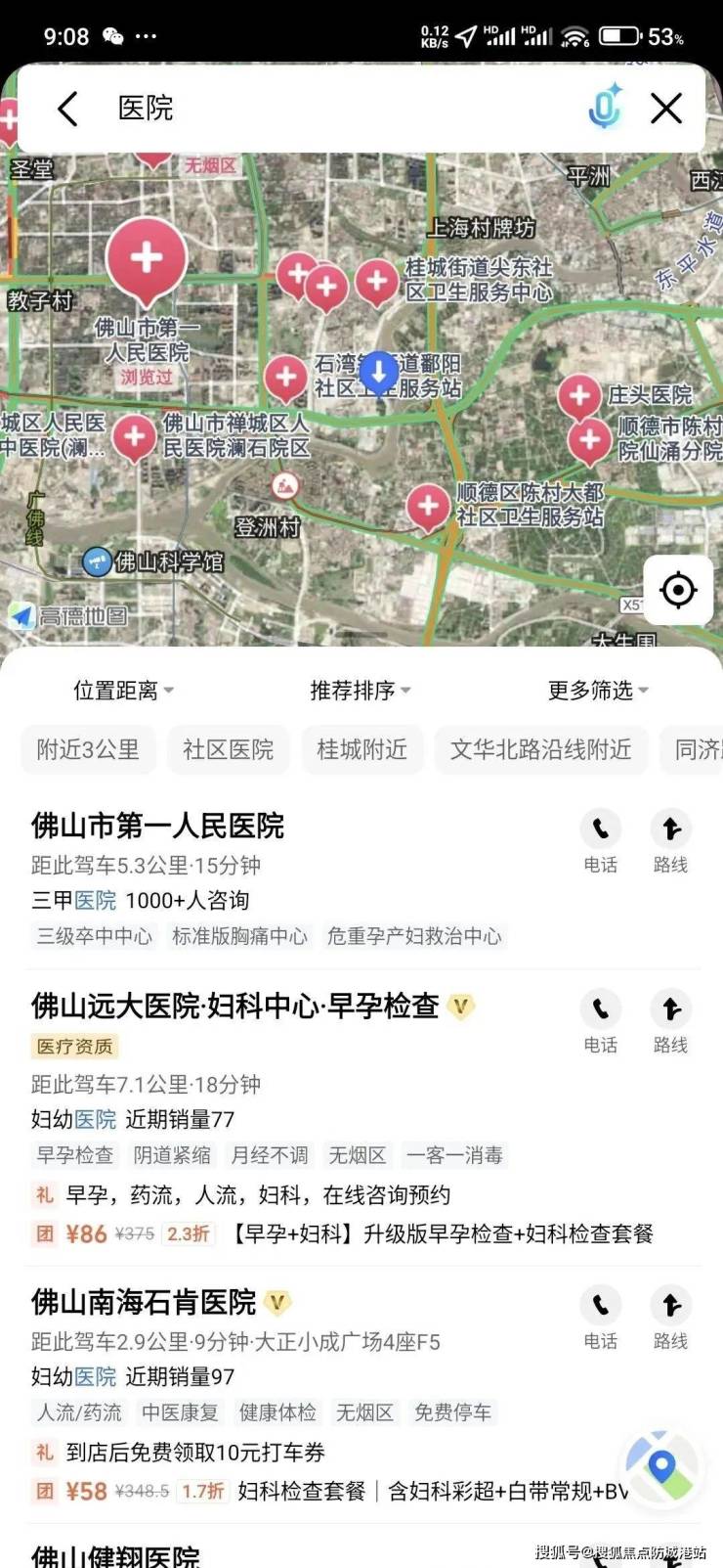 比较近的是石肯医院约3km,开车10分钟左右,佛山市第一人民医院【三甲医院】约5.3km,开车15分钟左右