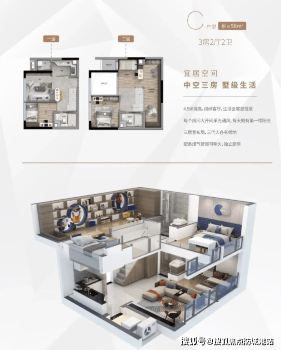 项目主力打造33-58㎡复式LOFT产品,巧妙利用垂直空间,将有限面积演绎出无限可能。以58㎡三房户型为例,不仅实现三房功能分区,更罕见配置明火厨房与生活阳台,极大提升日常居住的实用性与舒适度;而33㎡小户型则主打高性价比与灵活投资属性,部分单位采用双钥匙设计,可分隔为两户独立空间,便于分租运营,有效提升租金收益。全系户型采用双环通走廊设计,优化通风采光效果,确保每一户都能享有良好的自然光线与空气流通,营造健康宜居环境。