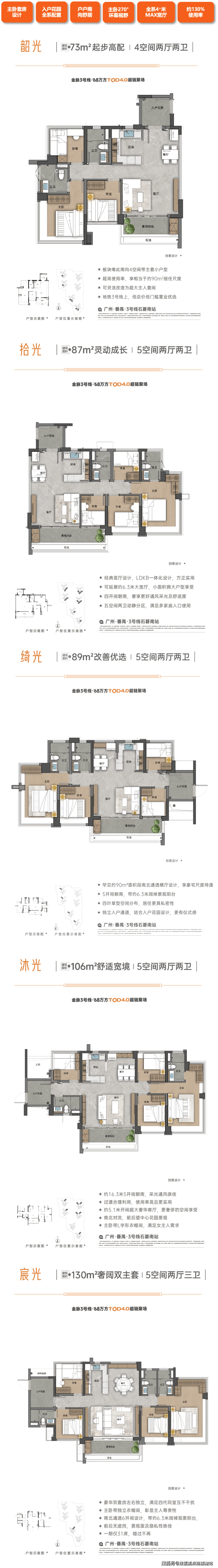 在售户型涵盖建面73-130㎡三至五房,满足不同家庭需求: