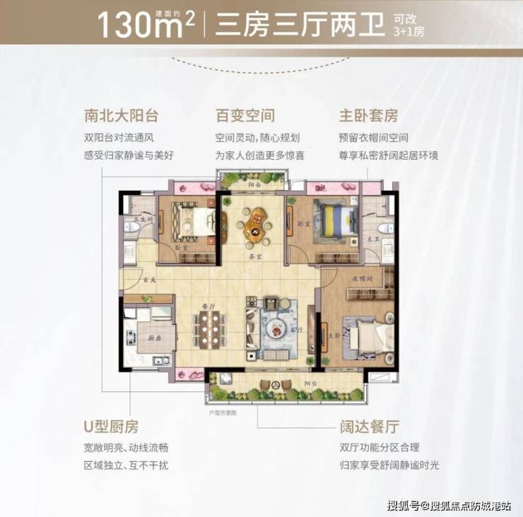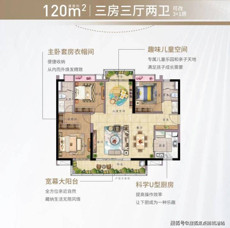 120㎡户型:三房三厅2卫,可改3+1房,空间宽敞灵活,适合大家庭或需要更多私人空间的家庭。