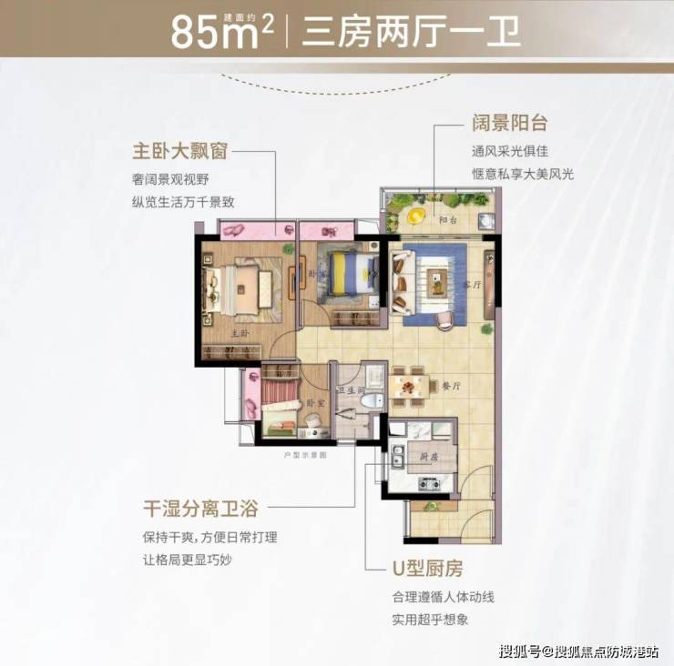 85㎡户型:三房两厅一卫,空间实用紧凑,适合小家庭或年轻夫妇。