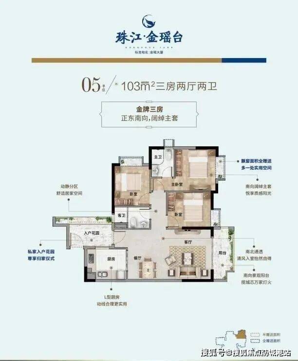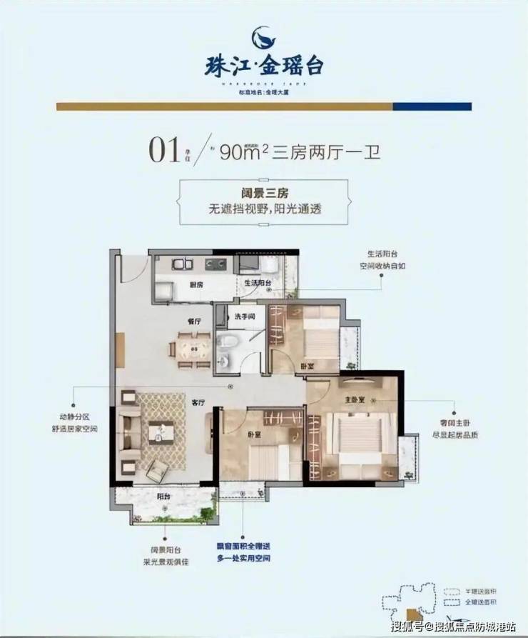 珠江・金瑶台推出了多种户型供购房者选择,包括 51 平方米一居室、79-103 平方米的二居室和三居室,以及 90-135㎡三至四房户型,满足不同家庭结构与预算的需求。其中,51 平方米一居室空间虽小但布局紧凑合理,功能齐全,客厅与卧室一体化设计,营造宽敞通透之感,独立厨房与卫生间,满足日常生活需求,适合单身人士或投资客。79 平方米二居室户型方正,动静分区合理,客厅连接阳台,增加采光与通风,两个卧室大小适中,可分别作为主卧与次卧,或打造一间书房,适合新婚夫妻或小家庭。95㎡全新南向大三房,三开间朝南,南北对流,双阳台设计,全屋通透,采光通风一流。90-135㎡三至四房户型则以 “滨江精工住区” 为设计理念,采用 “洄游动线”,LDKB 一体化方厅面积超 35㎡,主卧套房配备独立衣帽间及全景飘窗,约 70% 户型可望珠江后航道或庄头公园景观,部分高层单位更享 270° 环幕江景,满足多孩家庭及三代同堂的居住需求。