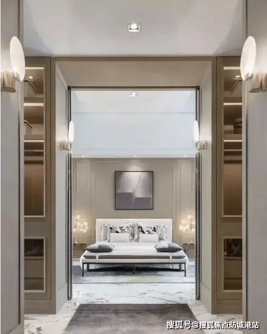 该户型采用向心围合布局,经过精准角度扭转,实现无遮挡视野,推窗即可拥抱云山盛景。室内以法式浪漫风情为基调,打造“水晶玻璃盒”式空间,客厅、餐厅、主卧、次卧等主要空间均配备至少两面采光,负一层引入采光天井,让阳光与清风贯穿全屋,记录下“光的行走印记”。主卧设计极具仪式感,进门即见严格对称的空间布局,左右两侧配备超大步入式衣帽间,廊道铺设星光红毯,尽头抵达睡眠区,尽显尊贵格调。睡眠区预留充足留白,搭配落地玻璃窗与简洁天花,让空间向外无限延伸,与自然相融。
