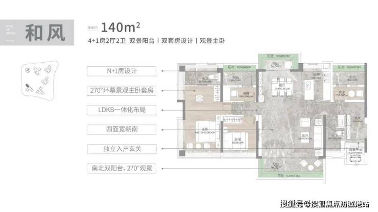 建面140㎡ 4+1房:南向采光面15.7米,南北双阳台,主套270度折叠屏飘窗,多功能房满足家庭多样化需求。