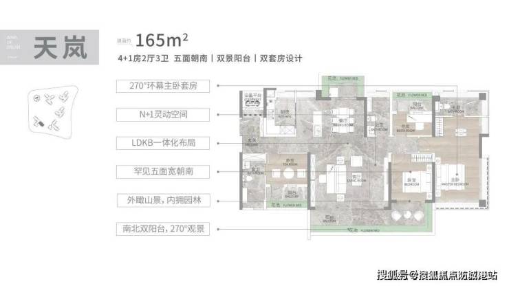 建面165㎡ 4+1房大平层:双阳台南北对流,朝南面宽17.4米,三面望山景,近9米L型景观阳台,双主套设计保障私密性。