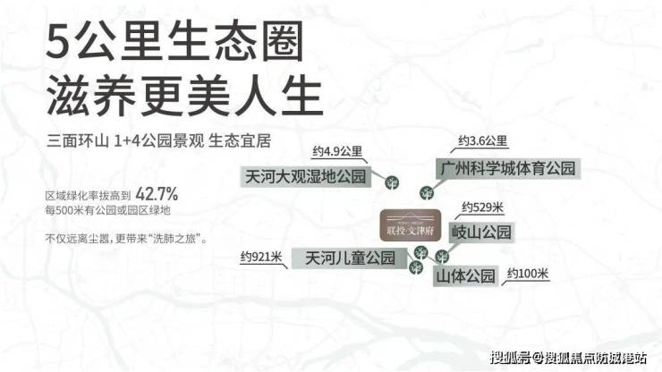 1+4公园体系:外揽天河大观湿地公园、广州科学城体育公园等4大公园,内建“一轴两心三节点六境园韵”低密园林,实测绿化覆盖率达42.7%。
