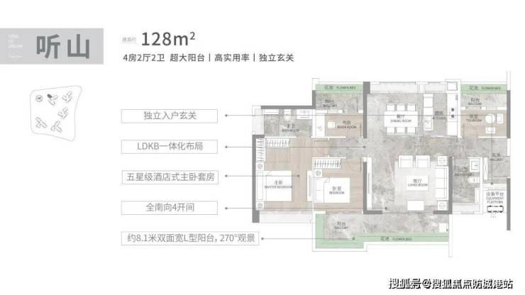 建面128㎡四房:L型独立玄关,8米L型阳台,餐厅全景飘窗实现南北对流,动静分区明确。