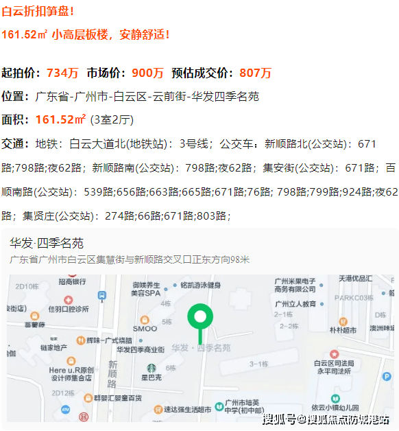 白云・华发四季名苑定位白云区高性价比改善型房源,项目位于广州市白云区云前街,地处白云成熟居住区。本次主推房源为 161.52㎡三室两厅户型,属于小高层板楼产品,居住密度低,安静舒适。房源起拍价 734 万,市场价约 900 万,预估成交价 807 万,价格优势明显。项目周边配套成熟,岭南新世界等大型社区环绕,生活氛围浓厚。作为改善型房源,161.52㎡空间开阔,布局合理,采光通风良好,满足高品质居住需求。项目所在区域交通、教育、商业、医疗等配套一应俱全,打造舒适便捷的居住体验,是白云区难得的高性价比笋盘。