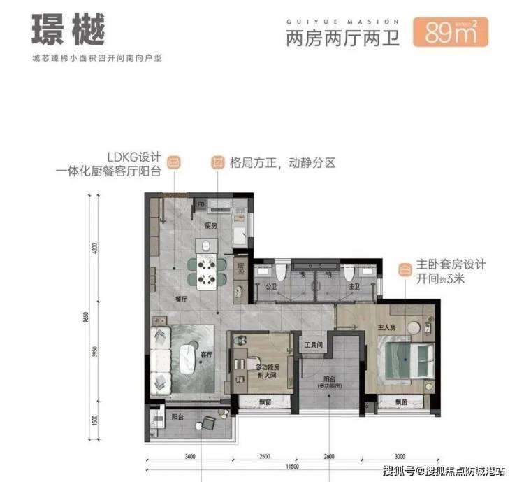 LDKG厨餐客厅阳台一体化:约11.9米南向,动静分离,约3.7米阳台,约11.9米四开间朝阳全景飘窗。