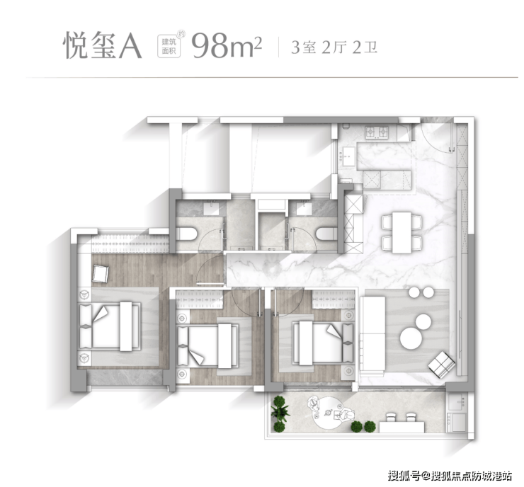 98㎡悦玺 A 户型:四开间朝南,半开放式中西厨房,LDKG布局,带6.4米阳台,适合刚需购房者。