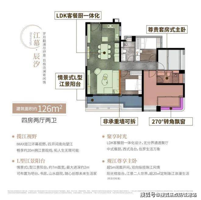最顶级的还要数126㎡的四房,这绝对是改善型购房者的首选。5开间南向望江的设计,带来了约20米的超长拥江景观线,270°环幕视野让江景渗透到房间的每个角落,这种体验真的太震撼了。L形江景阳台面宽达到了约7米,进深约2米,空间非常宽敞,不管是打造一个小花园,还是作为休闲娱乐区,都完全没问题。客餐厨一体化的空间更是开阔,亲朋好友聚会都能轻松容纳。主卧是“观江超级主卧”,不仅有超5米的阔面开间,还定制了江景梳妆台,躺在床上就能欣赏到珠江的美景,双向纵揽珠江风情,仪式感拉满。这个户型不管是空间尺度还是景观资源,都达到了豪宅的水准。