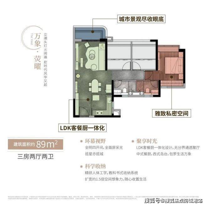 先看89㎡的三房,这个户型主打的就是“全明通透”。全明四开间的设计,让每个房间都能享受到充足的采光,环幕视野更是让室内显得格外明亮。LDK客餐厨一体化的设计,打破了空间的界限,形成了一个通透的聚厅,家人之间的互动更方便,朋友聚会也不会显得拥挤。而且户型还精研了人体工学,打造了教科书式的收纳系统,像玄关柜、衣柜、橱柜等都做了合理的规划,大大提升了空间的利用率,对于刚需家庭来说,这点真的太实用了。不过有一点要提一下,这个户型的北向江景视野不算理想,目前看出去还有一些村落,但好在周边的旧改已经在推进了,相信过几年环境就会有很大的改善。
