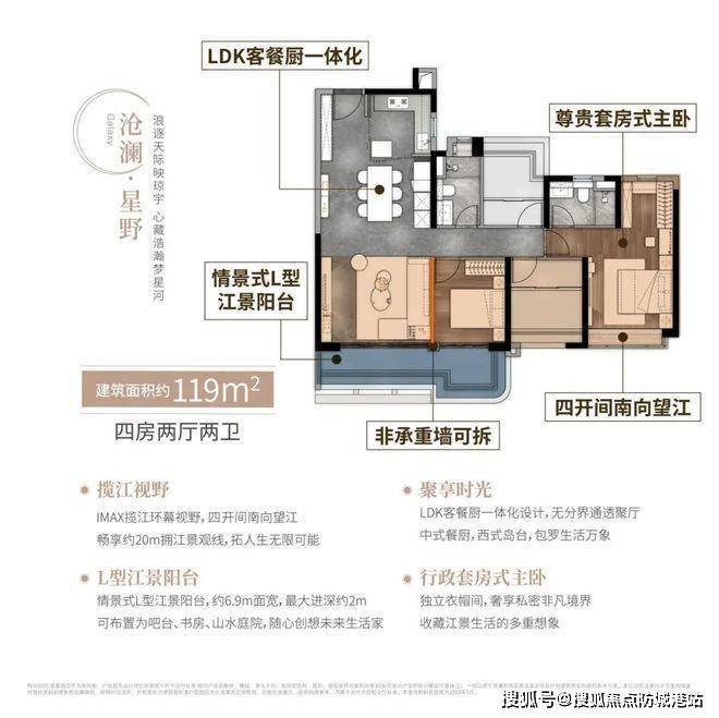 再看119㎡的四房,这个户型的江景视野就非常出色了。270°环幕视野,加上四开间南向望江,能享受到约12米的拥江景观线,站在客厅里就能把三江交汇的壮阔景色尽收眼底。L形的江景阳台更是亮点,约6.9米的面宽,最大进深约2米,平时在这里喝喝茶、看看江景,简直是一种享受。同样采用了LDK客餐厨一体化设计,空间通透感十足。主卧是行政套房设计,搭配了独立衣帽间,既能满足储物需求,又能保证私密性,让主人的生活更有格调。这个户型不管是四口之家还是三代同堂,都能住得很舒适。