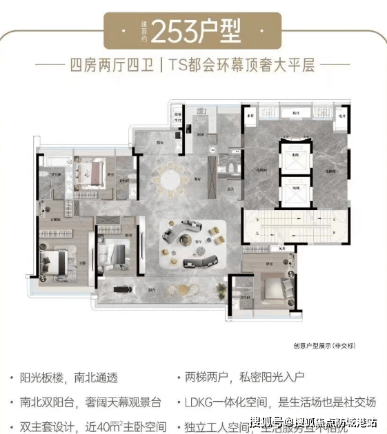 建面约253㎡定奢五房,同样是中轴园林上的环幕景观楼王,采用限量级CBD低密板式高层设计,是项目的顶级户型,彰显高端品质与身份象征。该户型配备专梯专户,拥有私属电梯门厅,尽显私密尊崇;四开间朝南,南北对流阳光满格,采光通风极佳;双阳台设计,拥有约10.3米宽巨幕阳台,能够全方位欣赏中轴园林美景,视野开阔,气势磅礴;双主卧套房设计,让孩子多一度独立空间,兼顾了家人的陪伴与私密;总统级主卧奢套,配备步入式衣帽间、双洗手台、浴缸,媲美汇悦台的高标准公建化立面,让业主能够享受顶级的居家体验;同时,该户型采用七大高品质超感精工,对标宝格丽酒店,携手杜拉维特、汉斯格雅等德系一线国际品牌,铸就高定奢宅品质之作,满足顶豪客群的高端需求。
