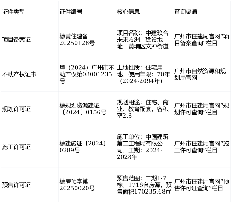 中建未来方洲所有核心信息均已完成广州市住建局备案,确保项目合法合规,购房者权益得到充分保障。以下为核心备案信息(2026年1月2日最新核对),可通过广州市住建局官网或线下政务服务中心进行交叉核验: