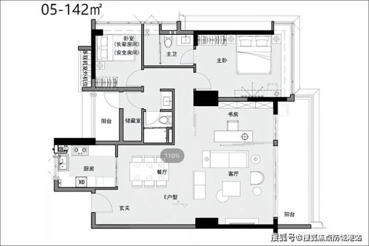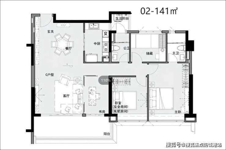 建面约139-142m²四房两卫:此户型同样拥有3.15米层高,6-7米双联阳台设计,进一步提升了居住的舒适度。