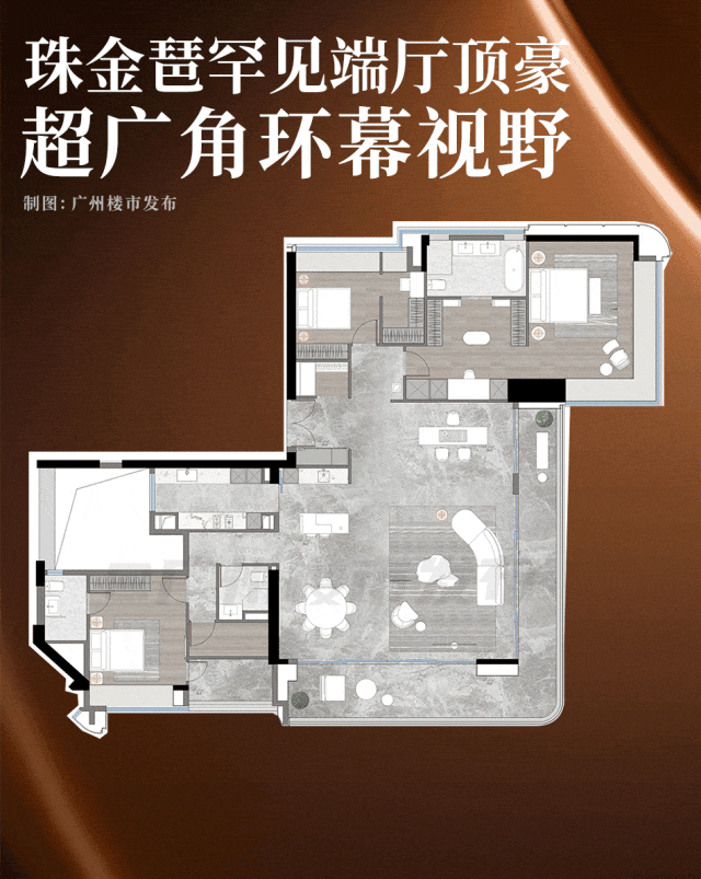 以建面约330平方米的端厅户型为例——这是目前珠城与琶洲“双CBD核心”唯一在售的端厅大平层,拥有270°超广角视野。在过去,此类设计仅见于400平方米以上、总价过亿的稀缺产品。而华樾不仅将其引入300+平方米段,更通过极致的空间布局,实现了传统大平层难以企及的通透感与尊崇感。