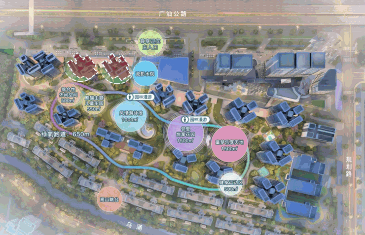在社区整体布局设计上,项目采用环抱式楼栋规划理念,高层楼栋围绕中央大型园林围合排布,这种设计方式经过专业人居设计测算,优势十分突出。一方面,能够最大程度保证每一栋楼栋、每一户户型的采光面与通风效果,避免楼栋之间互相遮挡,南北通风对流,室内采光充足,告别潮湿阴暗的居住环境;另一方面,后排楼栋南向无遮挡视野,可直观眺望山林景观、河景资源,高层住户甚至可以远眺广州塔、东西塔等城市地标,景观视野层次感极强。同时,围合式布局能够形成独立的社区空间,隔绝外部道路车流、人流干扰,社区内部更加安静私密,安全性和纯粹性大幅提升。