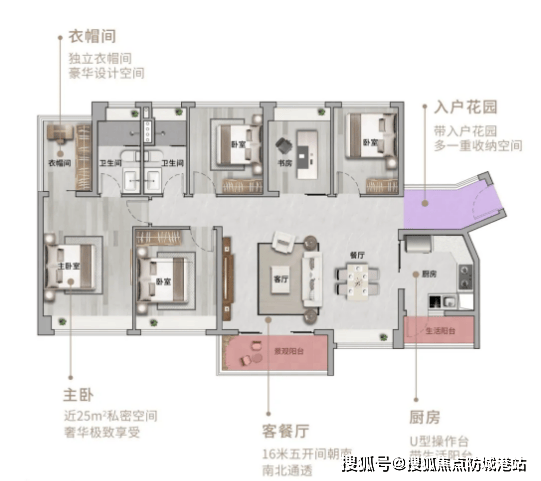 【119㎡4+1房2厅2卫】:该户型采用单边位布局,拥有15米南向开间,南北通透,通风采光效果一流。南向奢阔主套配备独立衣帽间,私密性和舒适度兼具,是改善型购房者的首选户型。低总价即可在天河入手大四房,性价比突出,能满足多人口家庭的居住需求。