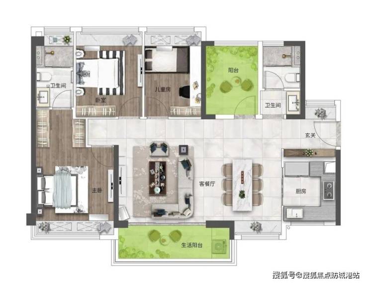 亮点:南北对流双阳台设计,清风不请自来;或是改造成四房,无论是二胎家庭还是三代同堂,每个人都能被照顾得妥妥帖帖。