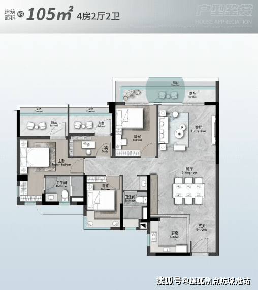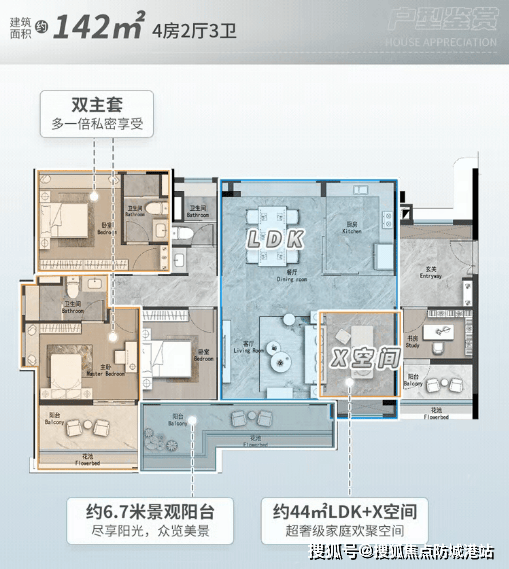 建面约140㎡四房:采用双主套设计,尺度奢阔,一步到位满足多代同堂的需求,免去了后续换房的繁琐与成本。