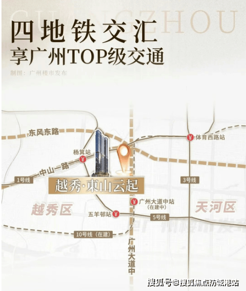 『越秀东山云起』坐落在中山一立交西侧,紧邻珠江新城,占据老东山的核心地段,集越秀区与天河区的双重优势于一体。项目距离地铁1号线杨箕站约700米,距离五羊邨站和体育西路站约800米,交通便捷。预计今年通车的10号线将在广州大道中设站,步行仅需约400米。驾车出行方面,通过中山一立交可以轻松到达东风东路、中山一路和内环路等主要干道,实现快速通达城市各区域。