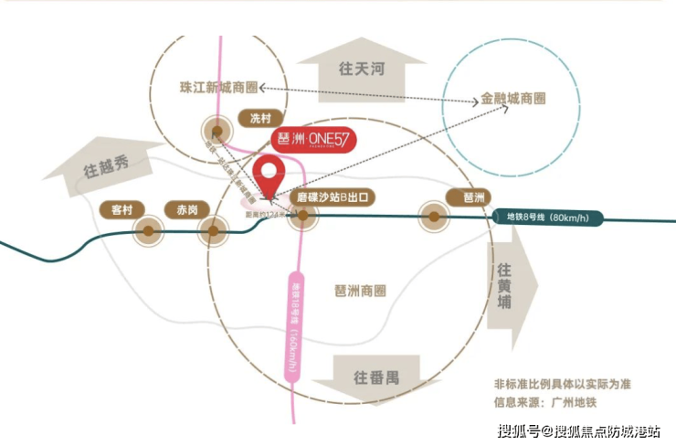 琶洲ONE57地理位置得天独厚,距离广州地铁8号线与18号线交汇的磨碟沙站直线距离仅百余米,真正实现出门即上地铁的生活体验。其中,地铁8号线作为城市东西向主干道,贯穿多个重要生活与商业节点,而18号线则作为广州首条时速160公里的快线,快速连接琶洲与南沙、珠江新城等核心片区,大幅压缩通勤时间。