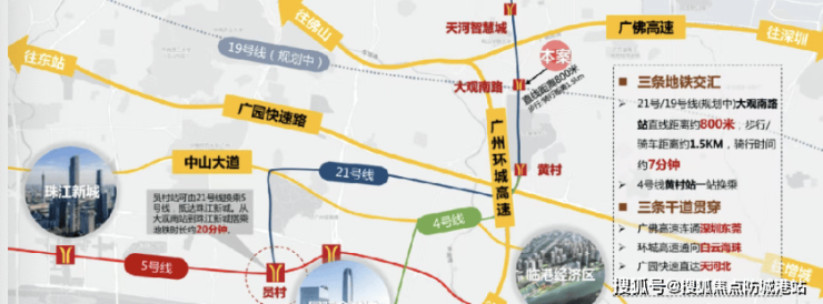 地铁(三轨交汇):距21 号线大观南路站约 800 米,5 站达员村(换乘 5 号线),7 站直达珠江新城;近邻4 号线黄村站(约 1.5km)及规划中19 号线,3 线贯通全城。