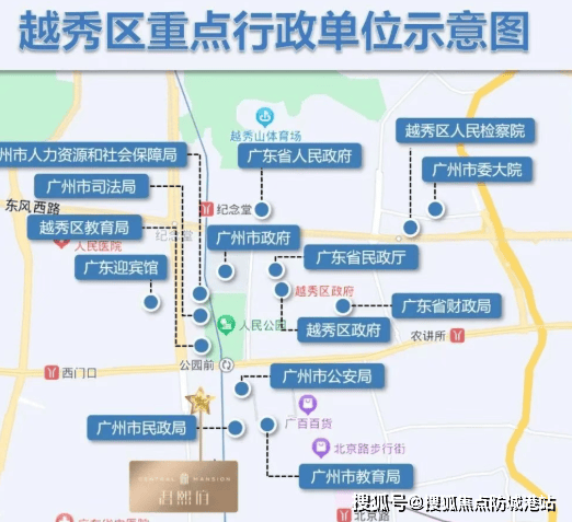 项目地处越秀区传统中轴线,作为广州建城 2200 多年来从未偏移的城市中心,这里汇聚了省、市行政资源,周边超 8 成省直机关单位、超 1/3 市直机关单位及 1/5 外国驻穗领事机构林立,地段价值无可比拟。