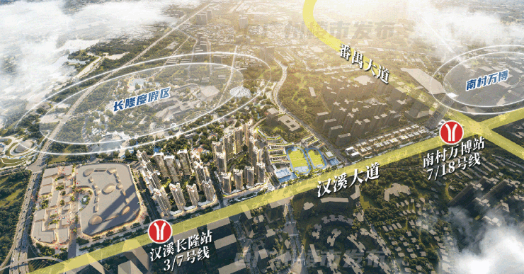 地处双地铁交汇处,步行300米即达7号线和18号线南村万博站,另有3号线汉溪长隆站距离项目仅500米。自驾方面,南大干线和新光快速等主要道路环绕,使得前往广州南站只需15分钟,半小时内可到达大湾区的核心区域。