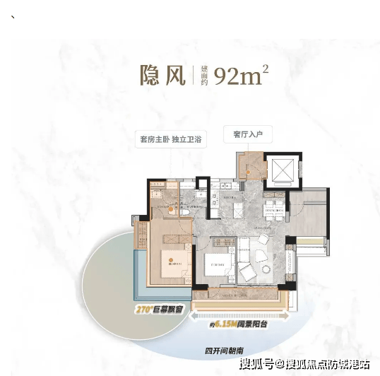 约92㎡三房两厅两卫(南向):总价约305-322万,三开间朝南,客厅连接约4.2m景观阳台,主卧配备独立卫浴,空间布局紧凑实用,适合三口之家或首次改善家庭。