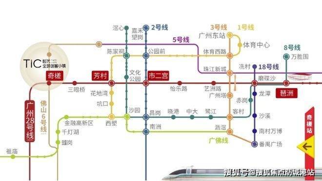 TIC 时代全球创客小镇交通位置优越,处于区域交通网络的重要节点。广州地铁 28 号线规划在项目旁设 “奇槎站”,计划于 2025 年年内动工。这条线路意义重大,建成后 2 个站可到荔湾,3 个站达海珠,4 个站就能到越秀,大大缩短了与广州核心城区的时空距离,方便居民前往广州进行商务活动、休闲娱乐等。