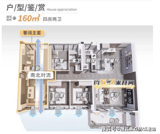 该户型为项目的标杆户型,大尺度空间设计,尽显豪宅气质,适合追求高品质居住体验的改善型购房者;南向全景江景阳台,长度约8米,宽度约2.2米,无遮挡瞰江,可全方位欣赏珠江后航道美景,阳台可打造为休闲茶座、健身区等,满足业主的个性化需求;客厅面宽约7.2米,横厅设计,空间开阔,搭配超大落地窗,采光和视野极佳,餐厅与客厅相连,同时连接北向阳台,形成南北通透的大空间,宴请宾客更有面子;主卧套间面积约30㎡,配备独立卫生间、超大衣帽间和观景飘窗,卫生间配备浴缸和淋浴区,享受奢华居住体验;两个次卧均为套间设计,配备独立卫生间,私密性强,空间宽敞,采光良好;还有一个卧室可作为书房或茶室,灵活使用;厨房为中西双厨设计,满足不同烹饪需求,操作空间充足,动线合理;三个卫生间均为干湿分离设计,品质感拉满。
